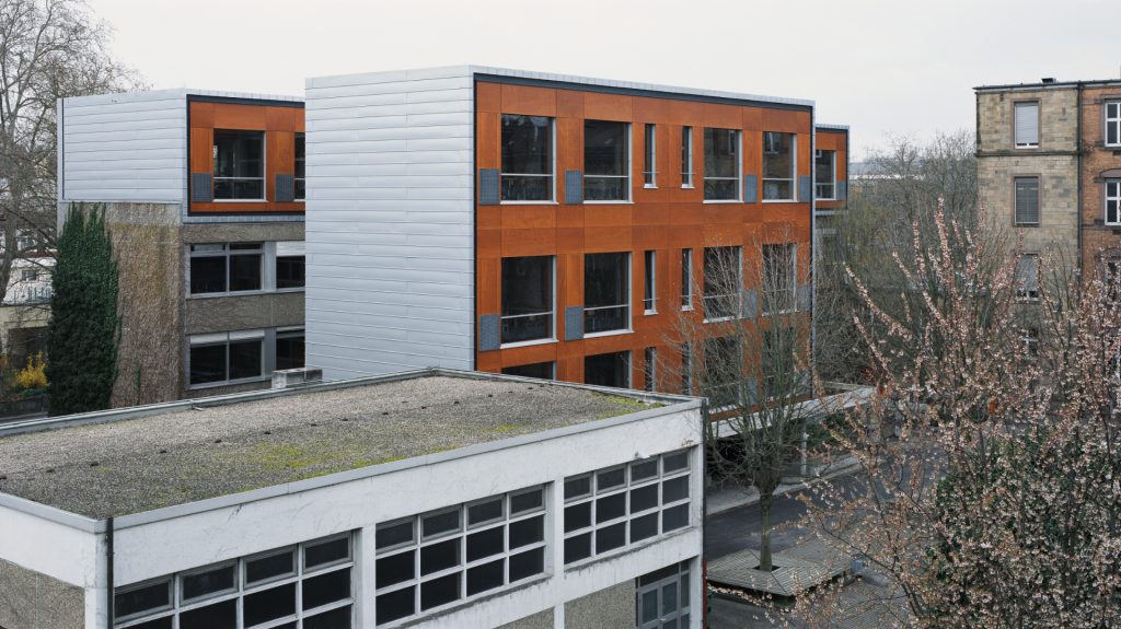 Durch die Enge des Schulhofes und die somit zu erwartende ausgeprägte Präsenz des neuen Gebäudes wurde von vornherein eine Fassadengestaltung gesucht, die sowohl durch eine warme, rötliche Farbe eine Verbindung zu den beiden Sandsteinbauten der Ludwig-Erhard-Schule und des Kantgymnasiums herstellt, so eine räumliche Einheit definiert, als auch mit einem warmen und freundlichen Charakter die Hofatmosphäre prägt. Als geeignetes Material wurden schließlich großflächige Platten aus Bootsbausperrholz ausgewählt. Die ursprünglich im Bootsbau verwendeten Sperrhölzer werden durch einen mehrschichtigen Lasurauftrag geschützt. Die Fassade ist als vorgehangene, hinterlüftete Fassadenkonstruktion ausgebildet und konnte an den Hoffassaden des Anbaus, wie der Aufstockung ohne sichtbare Unterschiede ausgebildet werden. Die vollständig vorgefertigten und beschichteten Platten werden sichtbar mit VA-Schrauben auf der Aluminiumunterkonstruktion verschraubt. Analog zur Außenseite der Fassaden wurden auch die Innenseiten mit dem selben Holz verkleidet. Das Material wirkt so gleichermaßen in den Hof wie in die Klassen hinein. Es entsteht eine Verbindung zwischen Innenraum und Außenraum.