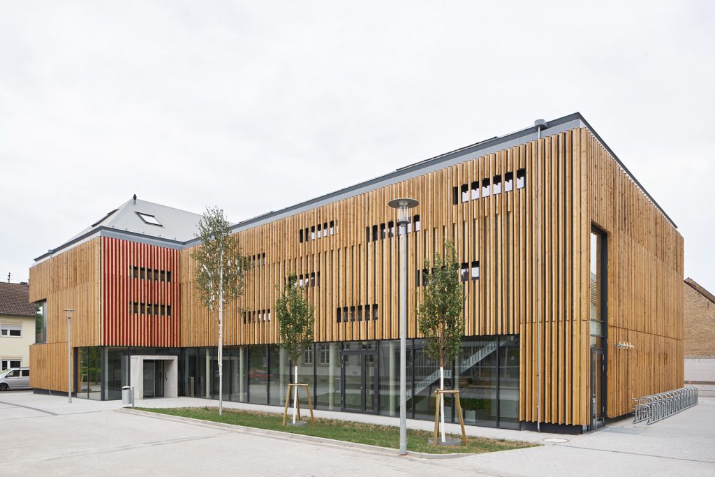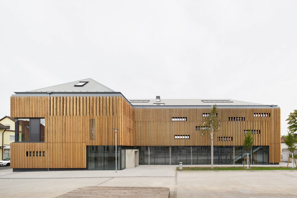 Die hohe Kompaktheit des Gebäudes, die hohe Raumausnutzung und der Verzicht auf einen Keller führen zu einem Gebäude mit geringer Außenfläche und somit zu reduzierten Investitionskosten und Wärmeverlusten. Die auf die Holzwände aufgebrachte Dämmung bildet in Verbund mit einer Dampfsperre eine durchgängig nahezu homogene dampfdichte, thermische Hülle, die als dampfdiffusionsgeschlossener Wandaufbau mit Dichtungsbahnen ohne Hinterlüftung geschützt und somit ebenfalls kosteneffizient und materialoptimiert ausgeführt werden kann. Zusätzlich bewirken die vorgesetzten Holzlamellen eine reduzierte Luftbewegung an der Gebäudeoberfläche und somit eine reduzierte Auskühlung. Zudem reduzieren sie die direkte Sonneneinstrahlung, insbesondere an der großflächigen Verglasung der Turnhalle. Alle nicht von Lamellen verschatteten Glasflächen sind mit Sonnenschutzverglasungen ausgeführt, um die sommerliche Überhitzung zu vermeiden. Der für Büro- und Seminarräume erforderliche Blend- und Sichtschutz wird mittels innenliegender Flächenvorhänge gewährleistet, die zusammen mit für Menschen nahezu unsichtbaren Hologrammdrucken einen wirksamen Schutz vor Vogelschlag bewirken.