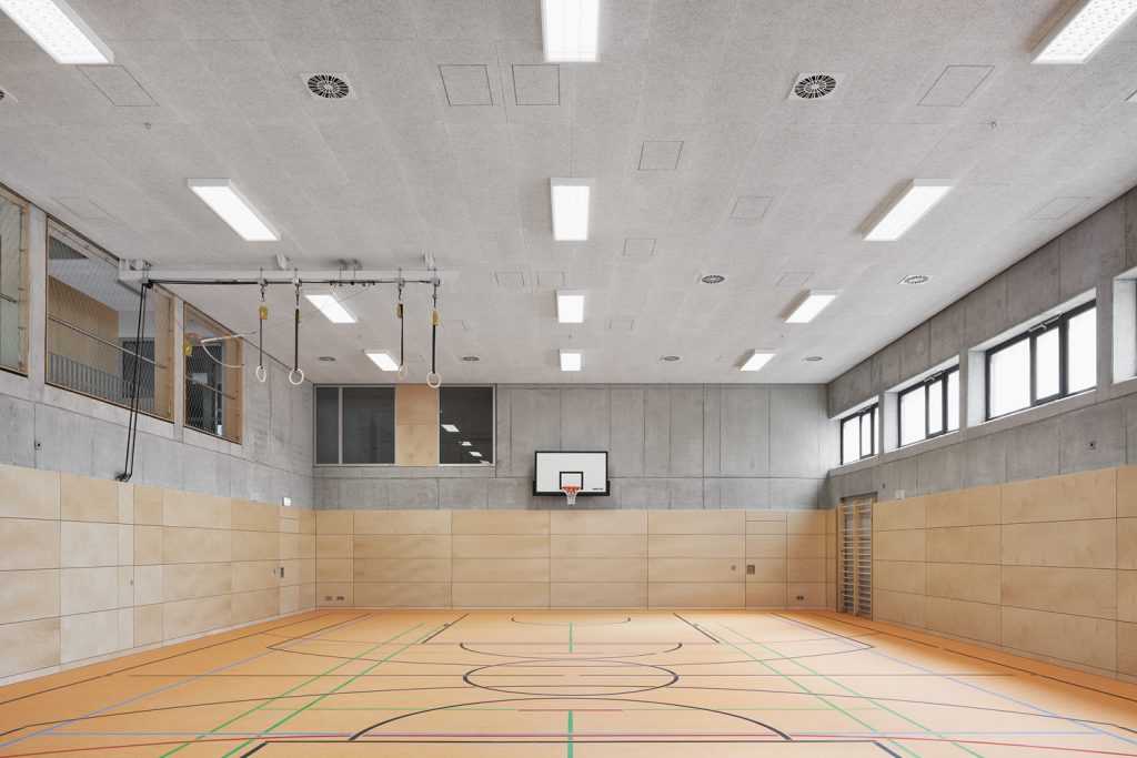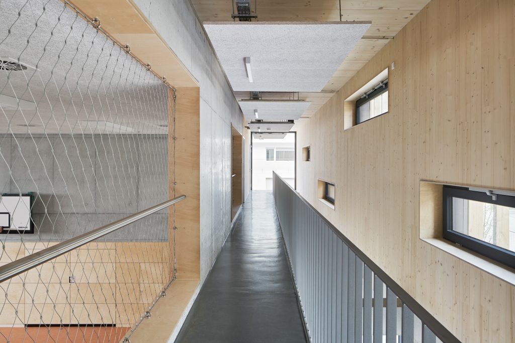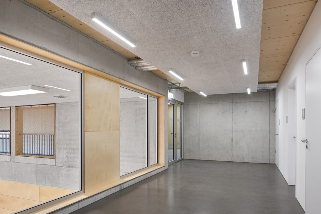 Die Konstruktion ist gestaltprägend für den Innenraum, da die hölzernen Elemente mit lasierten Fertigoberflächen in Sichtqualität geliefert und eingebaut werden. Beton wird als Sichtbeton ausgeführt. Zusätzliche Verschalungen oder Trockenbau sind nur noch für Sonderbereiche wie Küchen und Sanitärräume, sowie als Prallwände, Akustikdecken und zur gestalterischen Akzentuierung erforderlich. Farbakzente werden mit farbigen Bodenbelägen aus Linoleum und Kautschuk gesetzt.