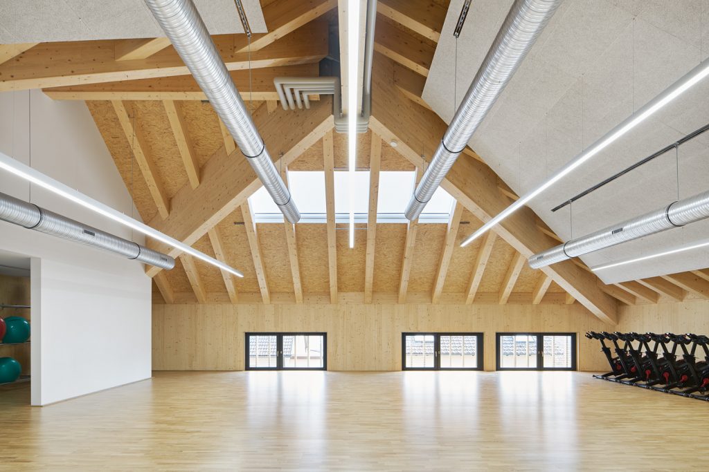 Die drei Bereiche Turnhalle, Gesundheitssport und allgem. Bereich bilden sich im Baukörper ab. Turnhalle und allgem. Bereich erstrecken sich über zwei Vollgeschosse, wobei die Turnhalle längs der Friedhofstraße orientiert ist, während die allgem. Bereiche längs der Kirchhofstraße angelegt sind. Die Geschosshöhe resultiert aus der geforderten Höhe der Turnhalle. Der Gesundheitssport mit seinen zwei großflächigen Raumeinheiten ist im Dachgeschoß angeordnet wodurch die Dachgeometrie auch von innen erlebbar wird. Zusätzlich wird das Erlebnis des Dachraumes durch die Belichtung vorrangig über Fensterbänder in der Dachfläche betont.